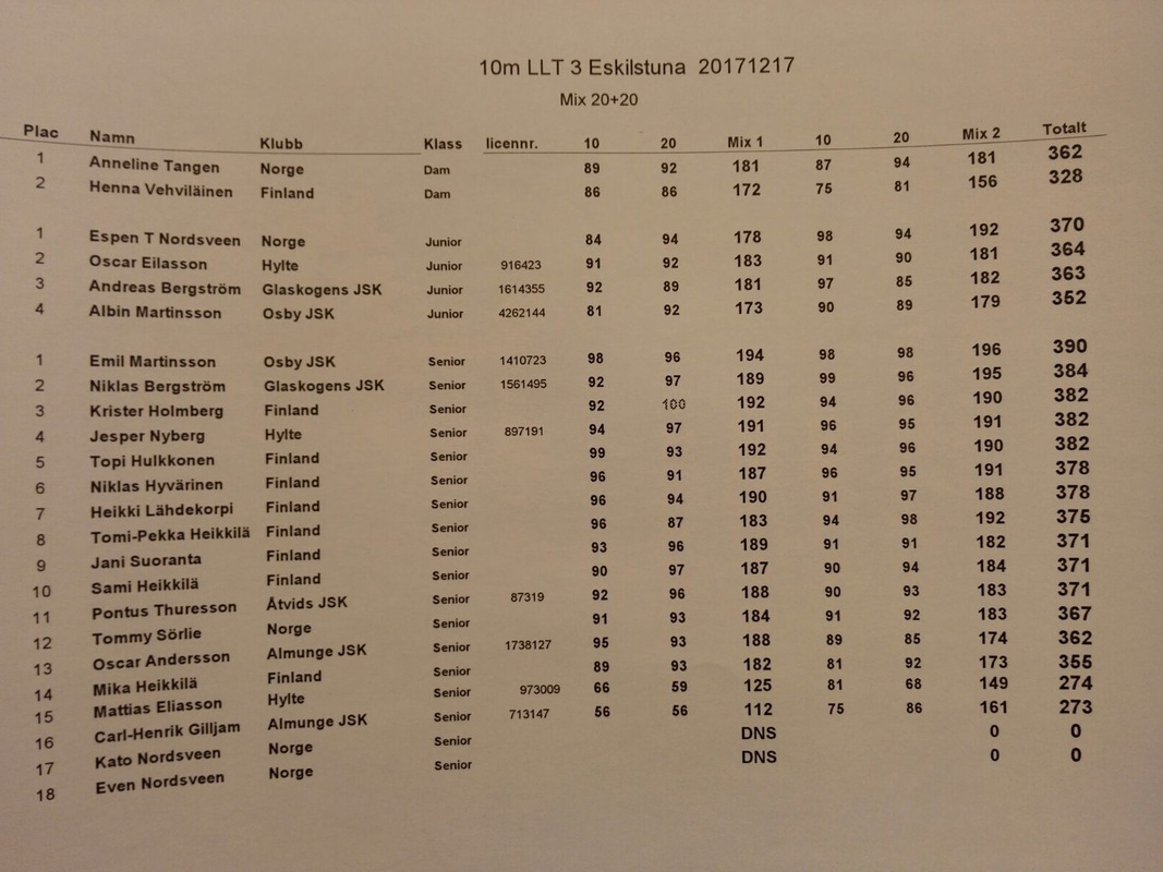 Sekajuoksut Sekajuoksuissa kilpailtiin sunnuntaina. Voiton vei suvereenisti Martinsson tuloksella 390. Suomalaisista huippukovia sarjoja väläytteli moni, mutta yksi huono laukaus pilasi huipputulokset. Esimerkiksi Krister Holmberg ampui yhdellä vitosella (5) 192 pistettä ensimmäisestä puolikkaasta ja Topi Hulkkonen ampui saman tuloksen 192 ensimmäisellä puolikkaalla huolimatta siitä, että sarjan viimeinen laukaus oli nelonen (4). Lopputuloksissa Holmberg oli Hulkkosen ja Nybergin kanssa jaetulla kolmannella sijalla tuloksella 382. Ulkomaan kisajännitys oli tiukkaa myös kymppiläisten joukossa, joista parhaimman tuloksen (375) ampui Tomi-Pekka. Henna ampui naisten sarjassa tuloksen 328, jolla hän sijoittui toiseksiu Tangenin voittaessa tuloksella 362.