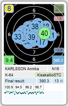 Annika ja Henri Karlsson Annika jatkoi ampumista lähes samaan tahtiin kuin huhtikuun alun SM-kilpailuissa. Siellä hän sijoittui kahdeksanneksi tuloksellaan 390,3 (kuva). Viivi Kemppi MyA vei voiton tuloksella 412,6. Eilen tulos jäi 5 kymmenystä parin viikon takaisesta eli 389,8. Myös Henri oli lopussa hyvässä vireessä ja se lupaa hyvää lauantain kultahippufinaaliin Saloon. Kilpasarjassa pitää kuitenkin olla hereillä alusta asti. Tuolos 281,1 |